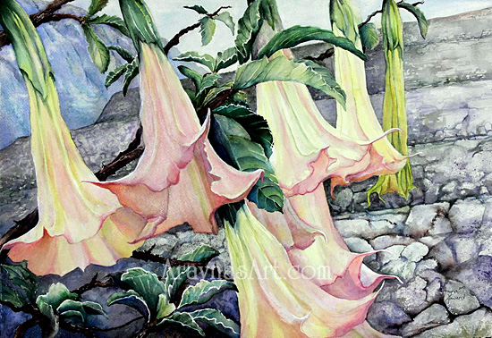 Angel's Trumpets in Machu Picchu 27" x 34" Watercolor on Paper Custom Matted and Framed $1,395 |